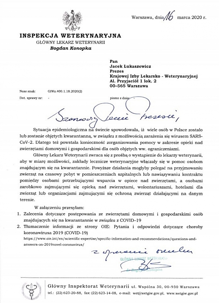 do pobrania: Zalecenia dla osób objętych kwarantanną w związku z COVID -19 dotyczące postępowania ze zwierzętami domowymi i gospodarskimi Pytania i odpowiedzi odnośnie choroby wywołanej przez koronawirus 2019 (COVID-19)