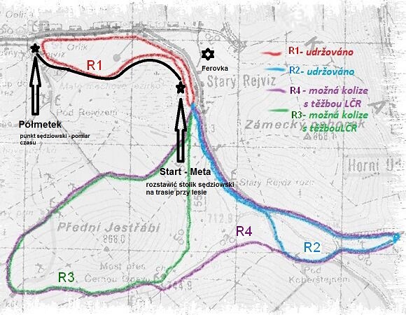 13.30 – start zawodników w kategorii senior, biegu wspólny kobiet i mężczyzn – trasa R1 (czerwona) 4,5 km, jeżeli będzie dużo śniegu biegniemy po pętli R1, jeżeli będą łaty biegniemy wg schematu "przy lesie", na szkicu zaznaczono położenie pensjonatu Ferovka: